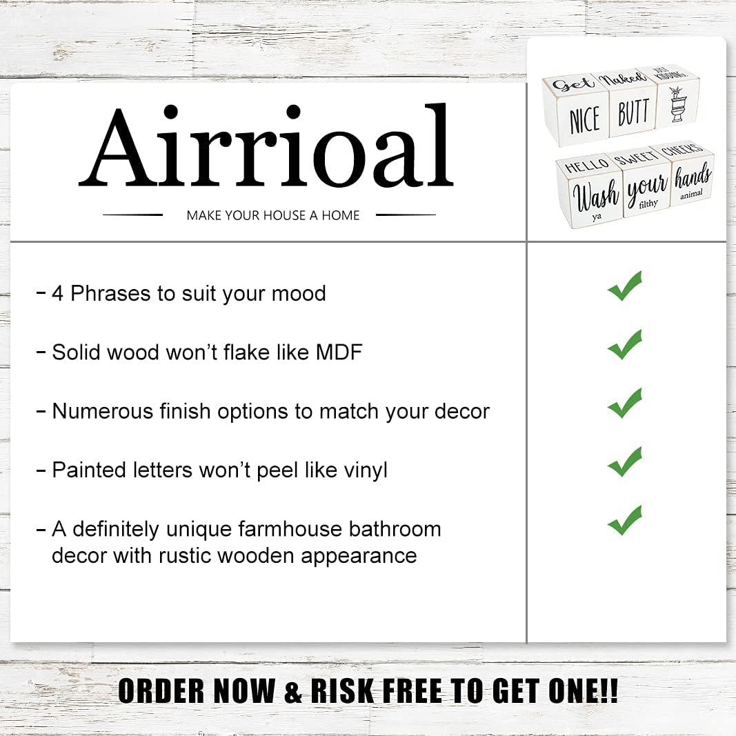 - 【FOUR-SIDED FUNNY SIGNS】- Printed with four-sided funny signs, Get naked, Nice Butt, Hello Sweet Cheeks and Wash Your Hands.The farmhouse rustic blocks decor is in unique design that could bring funny and relaxing feeling for room atmosphere. A good way to make the first-visiting guest laugh happily, thinking that you were cheerful and outgoing, feeling relaxed and getting closer.