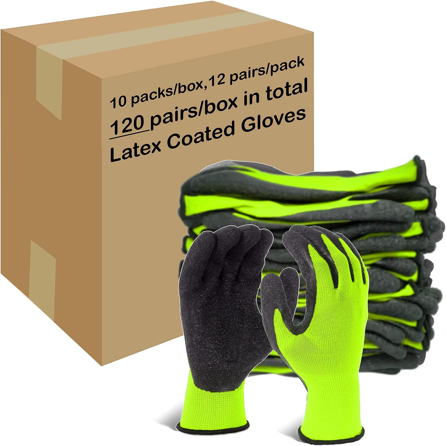Evridwear Crinkle Latex Rubber Hand Coated Safety Work Gloves for Men Women General Multi Use Construction Warehouse Gardening Assembly Landscaping (L-Size) Lime 120 Pairs Pack