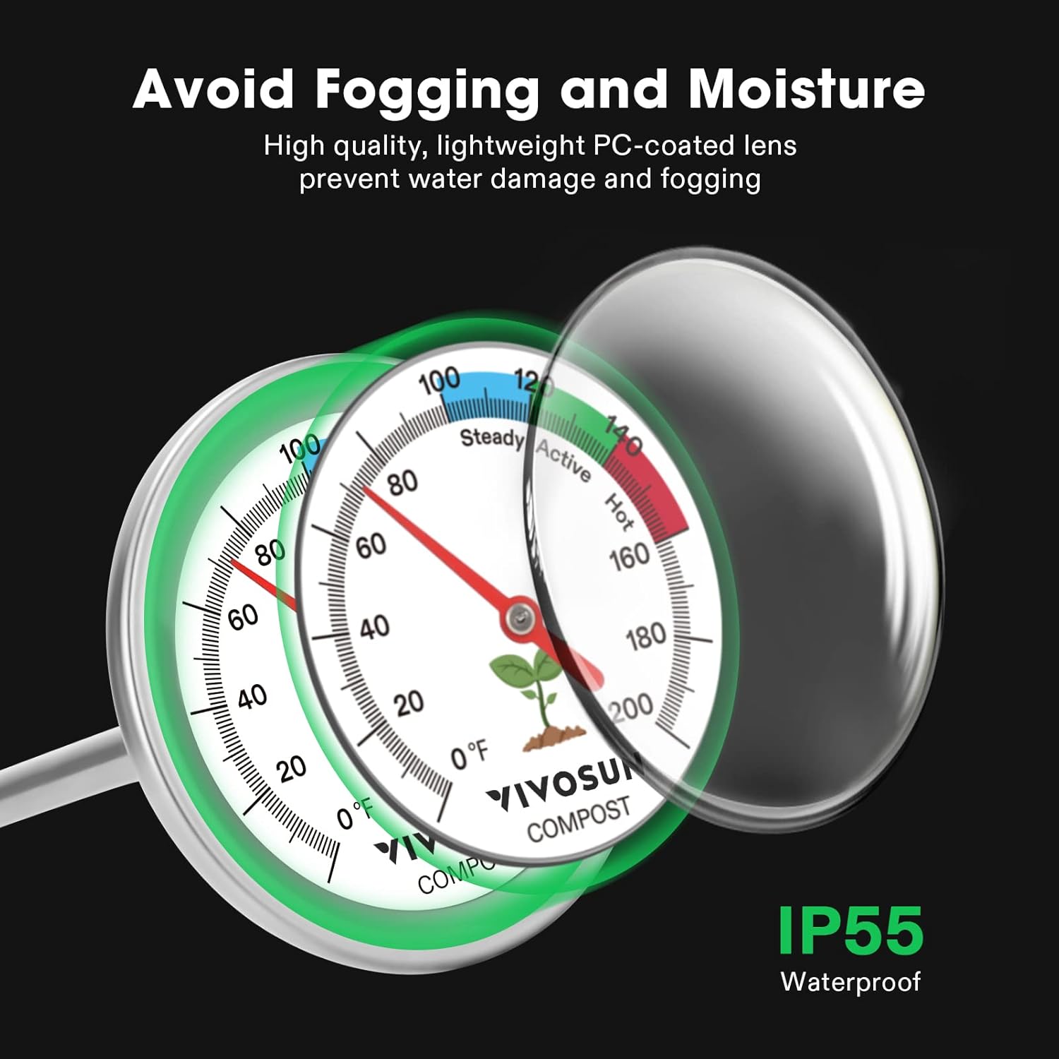 - Accurate & Clear Reading: IP55 waterproof PC-coated lens is sealed to keep out moisture and avoid fogging for easy & clear reading; Only ± 2°F accuracy so you know your compost pile’s true condition and can optimize accordingly