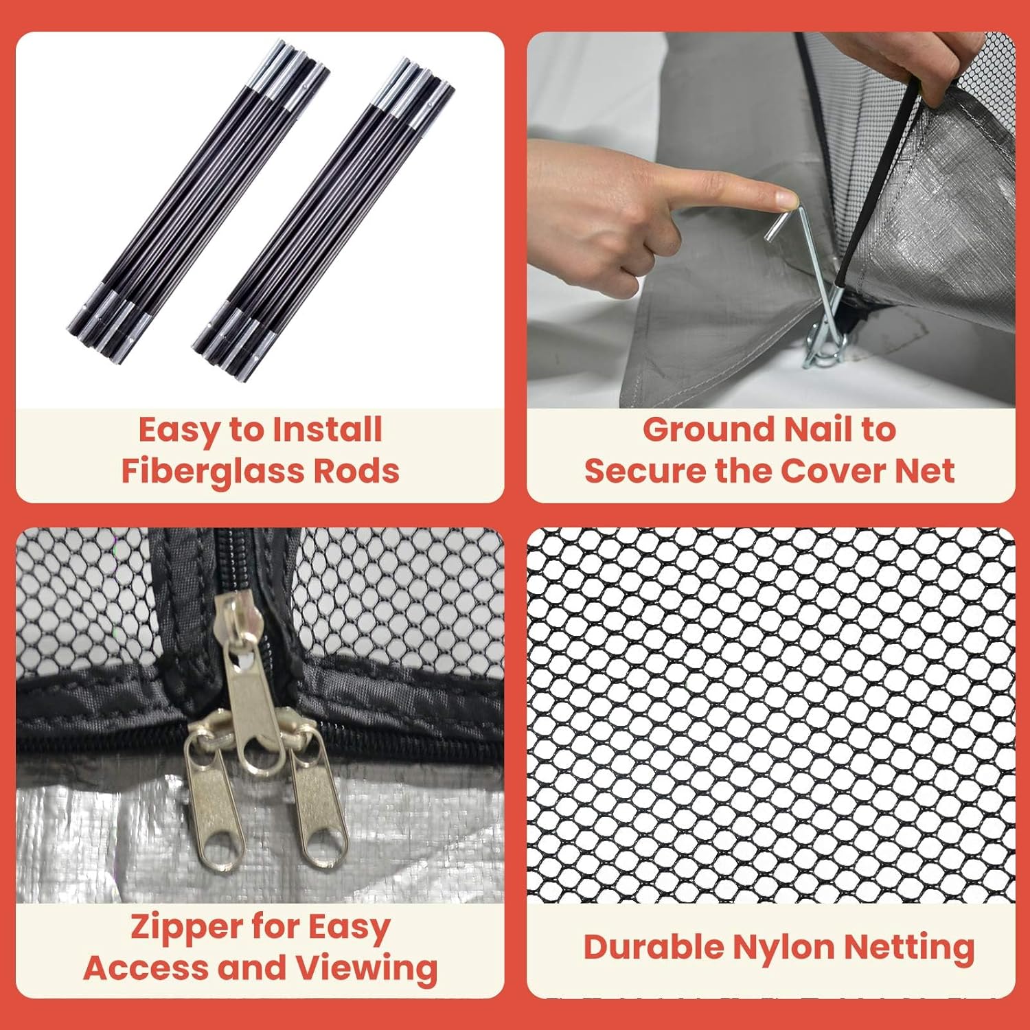 - Garden pond net easy set up - Follow Dome Cover Net installation instructions, the garden dome cover is easy to set up. Attach the connected fiberglass rods through the diagonal of the pond cover for fish and finally insert 4 corner pegs into the fiberglass rods and secure with ground stakes. Press the pond pool dome net bottom edge with dirt or sand, let the perimeter bottom of garden dome net can be tightly fitted to the ground, especially when it's windy.
