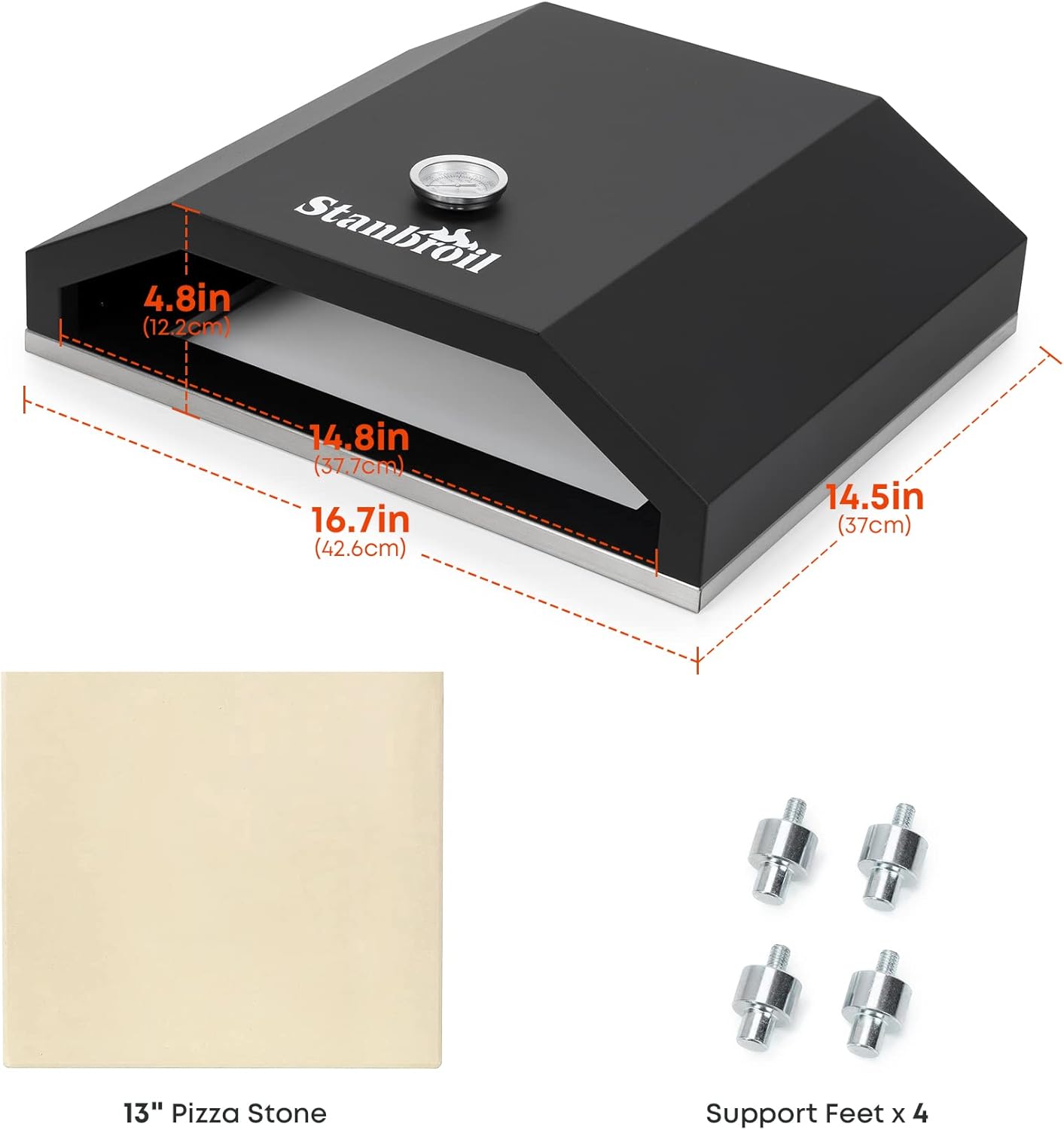 - Overall Dimensions: 16.7 x 14.5 x 4.8 inches, pizza stone: 13 x 13 inches.