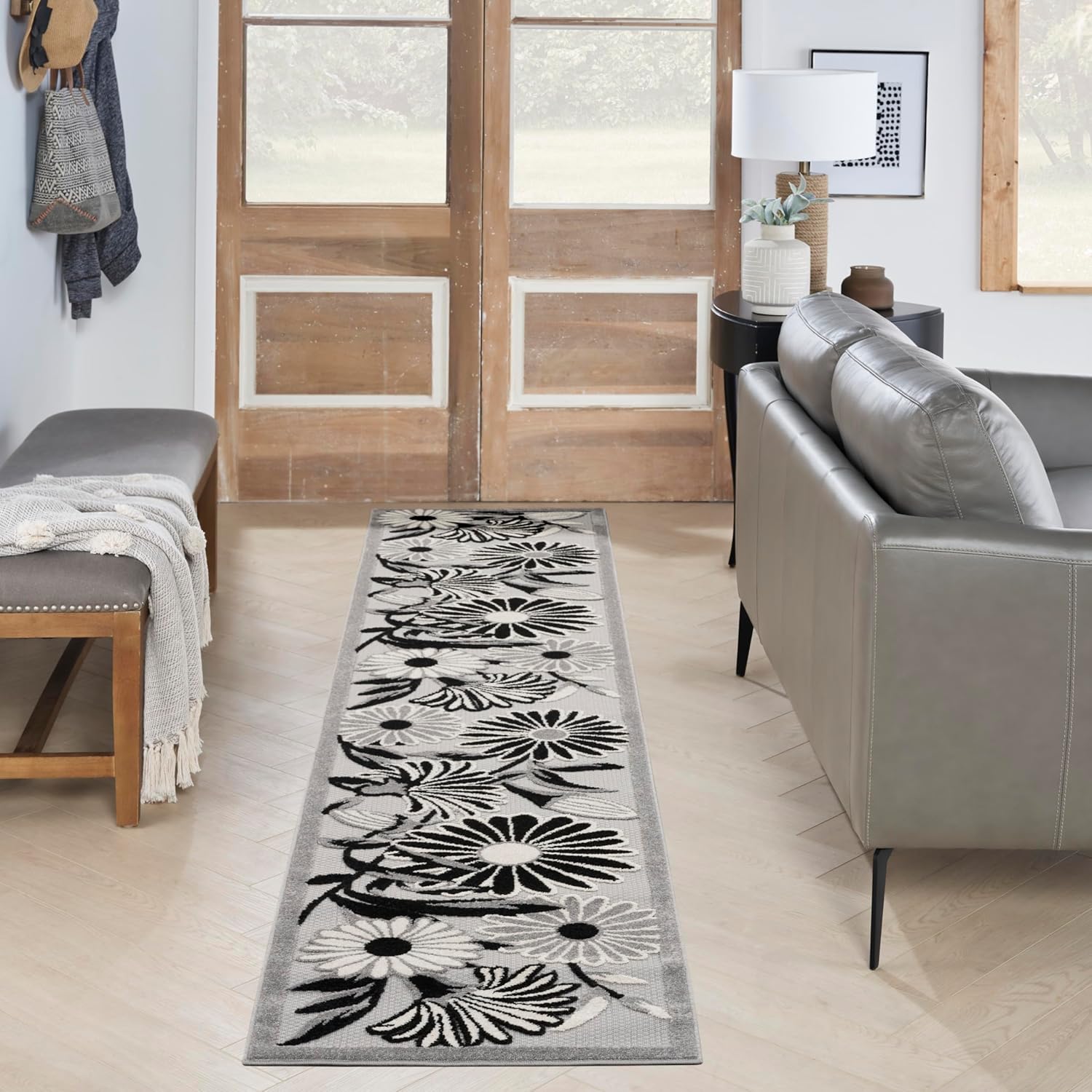 Nourison Home Aloha Black White 2'3" x 12' Area Rug, Easy Clean, Non Shedding, Bed Room, Living Room, Dining Room, Kitchen (12' Runner)