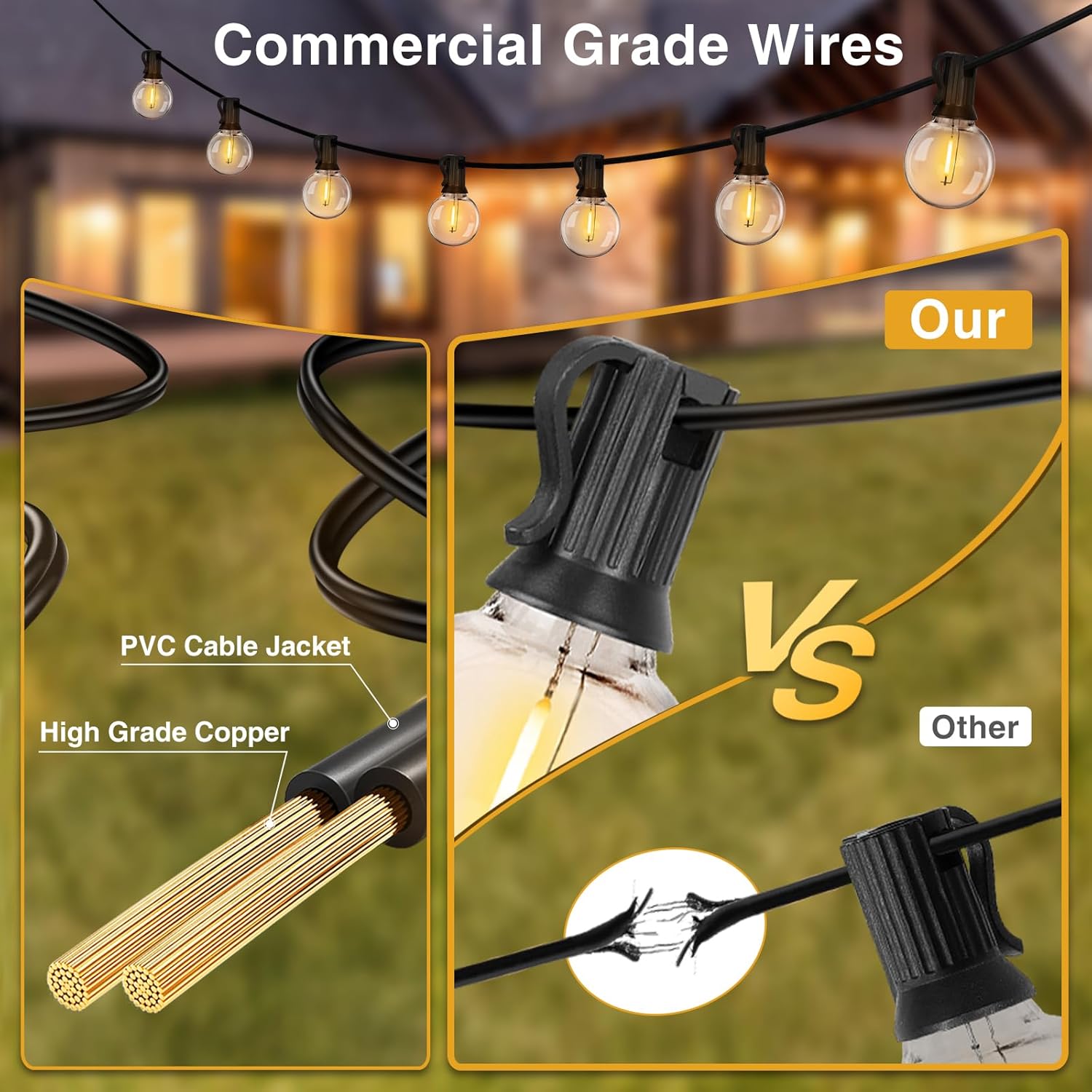 - Illuminate Your Outdoor Space: Enhance your garden, wedding, or courtyard ambiance with our premium Outdoor String Lights. These versatile outdoor lights, also perfect for patios and decks, feature certified LED bulbs emitting a warm 2700K glow, ideal for creating a cozy atmosphere.