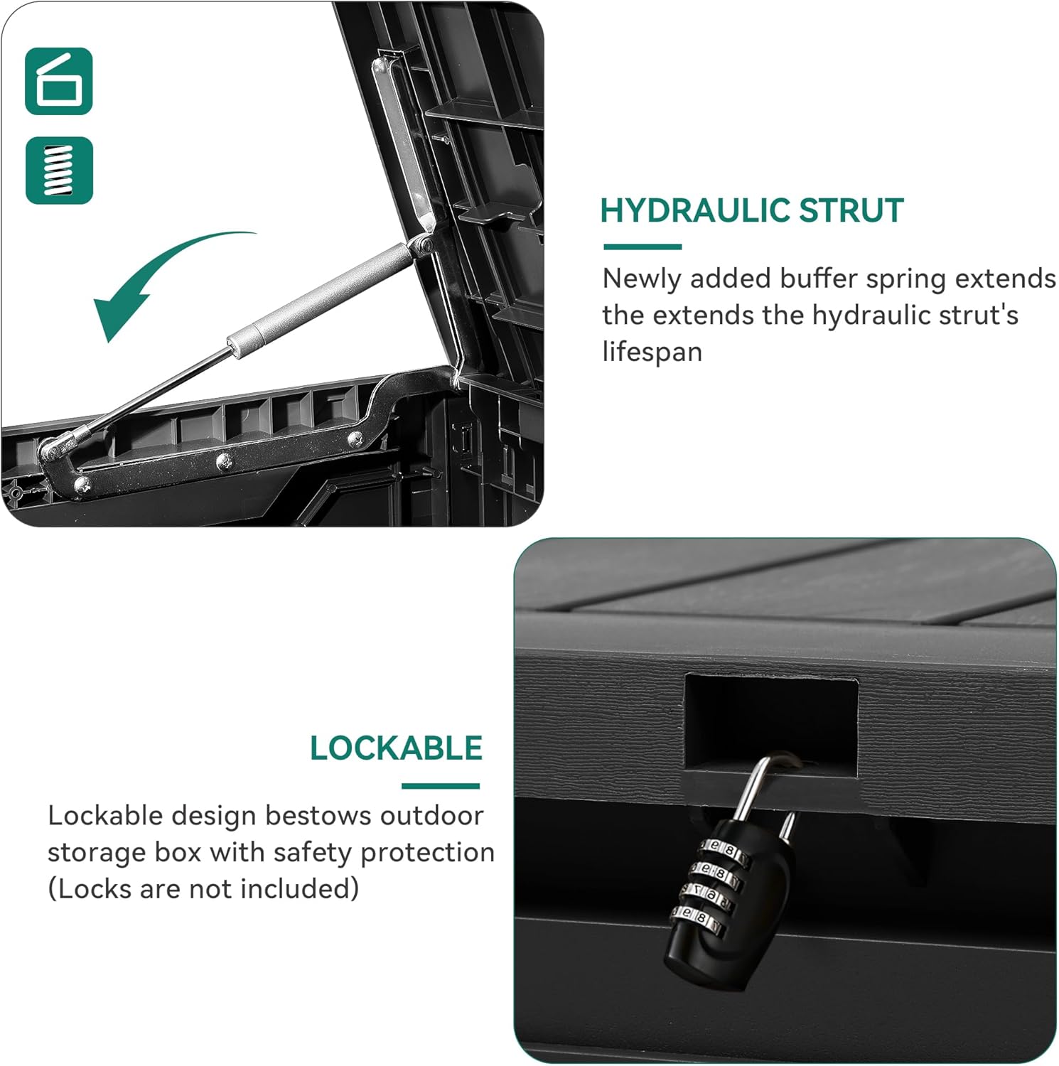 - Built to Last: Crafted from weather-resistant resin, these outdoor deck boxes are waterproof, rust-proof, UV-resistant, and fade-proof, making them ideal for long-term outdoor use in various climate conditions
