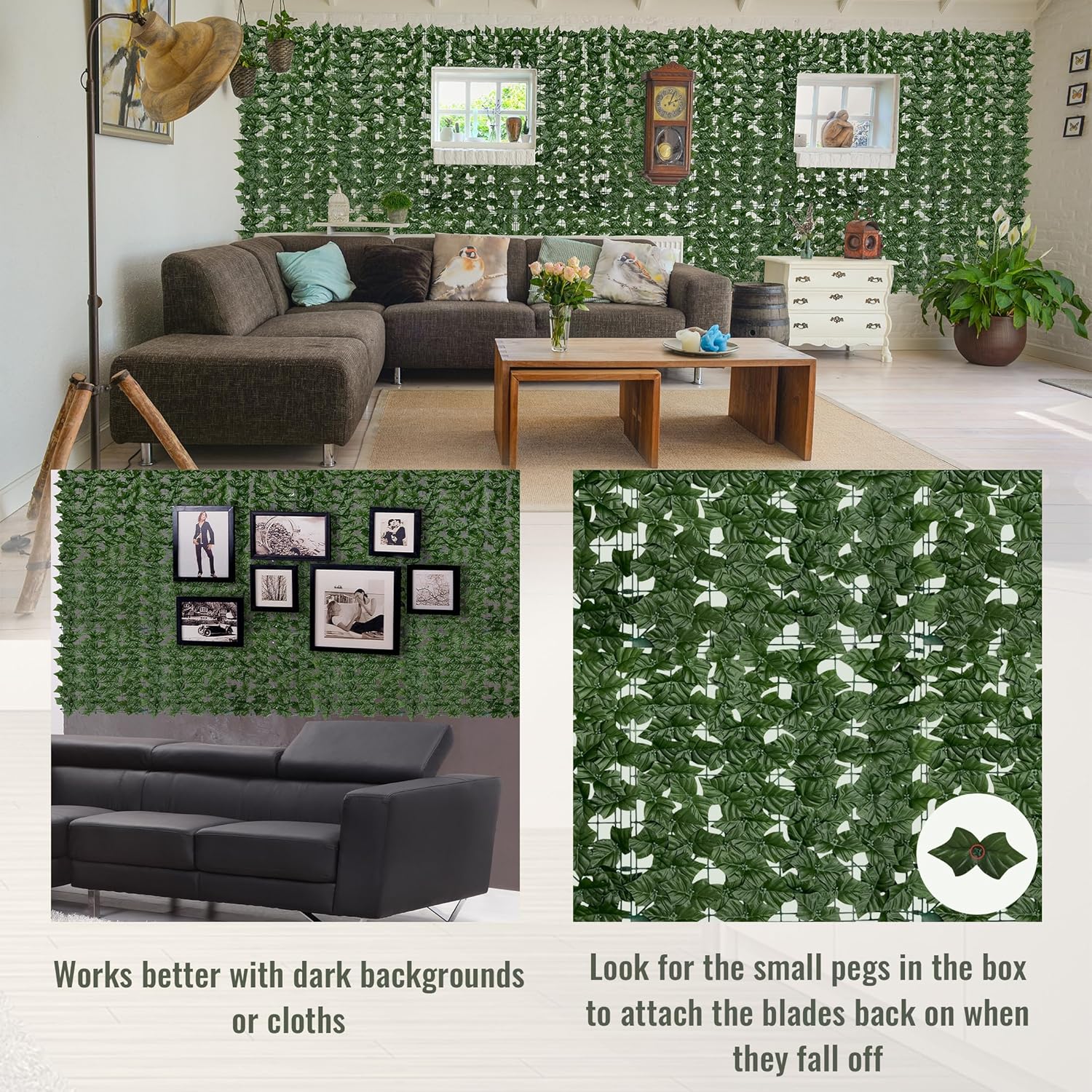 - Easy installation: the size of the artificial ivy grass wall panels is 40"×120" , which can be cut into any shape and size you want, and each panel is equipped with interlocking connectors for easy and simple connection. Install it in your room or fence with adhesive tape or our attached cable ties.