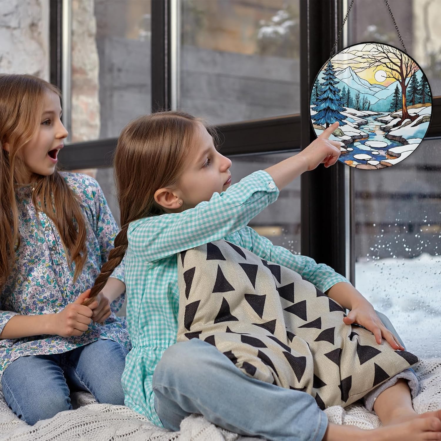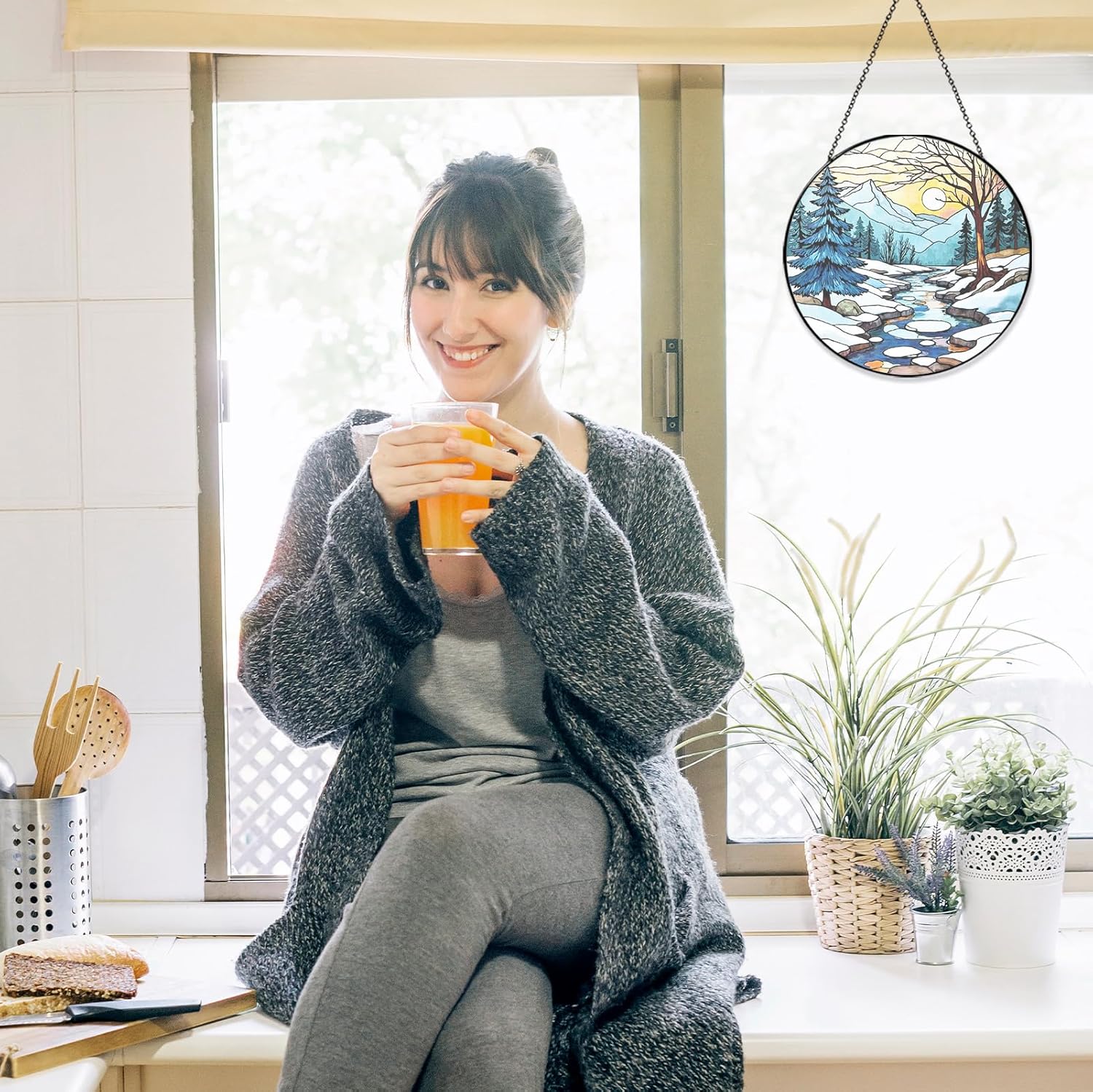 - Sun Catchers Indoor Window: This stained glass window hanging features a pine tree winter landscape in blue-white hues. When sunlight streams through, its double-sided light transmission creates mesmerizing reflections, perfect for window decor, sun catchers indoor window, or cottage core decor. An enchanting addition to any winter home decor living room or entryway table decor.
